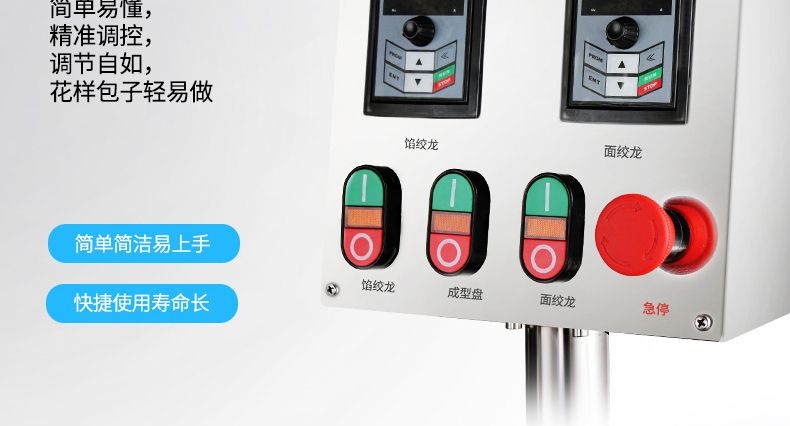 ◆ 本機(jī)采用雙絞龍送面、變頻無級調(diào)速,包子大小、出面出餡均可任意調(diào)節(jié),出面均勻、出面暢通、不傷面筋、不斷面筋,出餡系統(tǒng)優(yōu)點(diǎn):餡管不會掉餡,不會出現(xiàn)空包子,出餡速度快,壓力小,均勻,適合各種不同的餡料。解決了普通包子機(jī)菜餡走不穩(wěn)的問題。