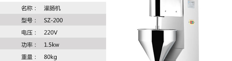 SZ-200灌腸機(jī),適合灌制各種香腸、紅腸、臘腸及糊狀制品。本機(jī)使用敞開式不銹鋼料斗,適用于連續(xù)添加物料;與灌裝手接觸部件全部采用優(yōu)質(zhì)不銹鋼制作以防生銹;該機(jī)自動(dòng)貨程度高,技術(shù)先進(jìn)、性能穩(wěn)定、操作簡便、工作效率高,具有不破壞物料成份,保質(zhì)、保鮮等特點(diǎn)。