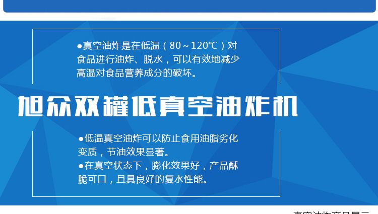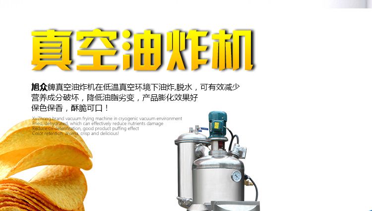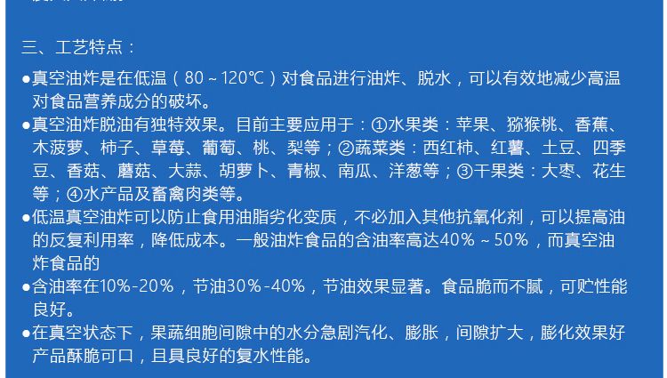 ●真空油炸是在低溫(80~120℃)對(duì)食品進(jìn)行油炸、脫水,可以有效地降低高溫對(duì)食品營(yíng)養(yǎng)成分的破壞。