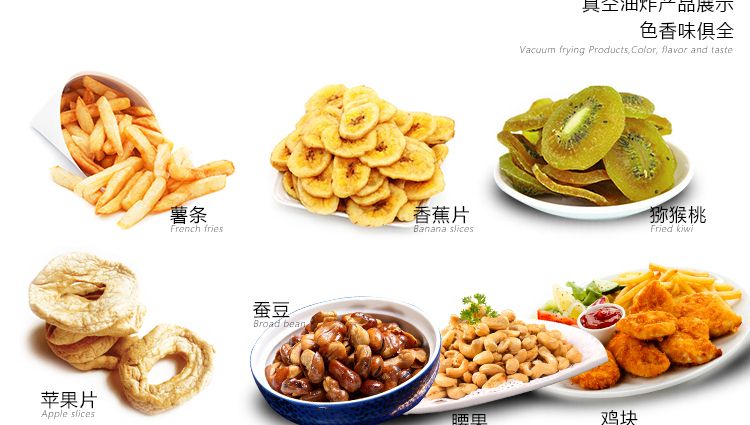 ●保色作用:采用真空油炸,油炸溫度大大降低,而且油炸鍋內(nèi)的氧氣濃度也大幅度降低。油炸食品不易褪色、變色、褐變,可以保持原料本身的顏色。如獼猴桃極易受熱褐變,若采用真空油炸,可以保持其綠色。