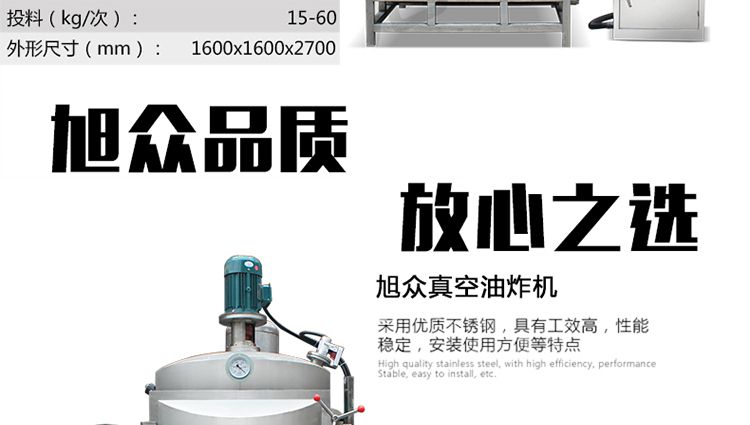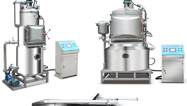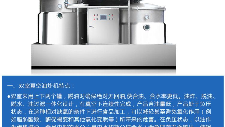 ●雙室采用上下兩個罐,脫油時確保絕對無回油,使含油、含水率更低。油炸、脫油、脫水、油過濾一體化設(shè)計,在真空下連續(xù)性完成,產(chǎn)品含油量低,產(chǎn)品處于負壓狀態(tài),在這種相對缺氧的條件下進行食品加工,可以減輕甚至避免氧化作用(例如脂肪酸敗、酶促褐變和其他氧化變質(zhì)等)所帶來的危害。在負壓狀態(tài),以油作為傳熱媒介,食品內(nèi)部的水分(自由水和部分結(jié)合水)會急劇蒸發(fā)而噴出,使組織形成疏松多孔的結(jié)構(gòu)。